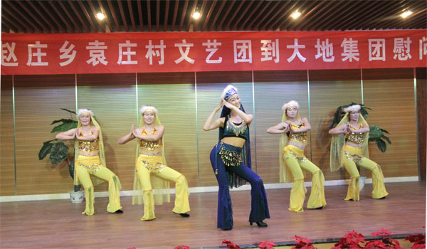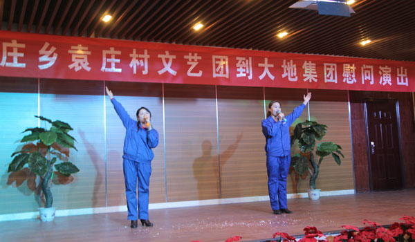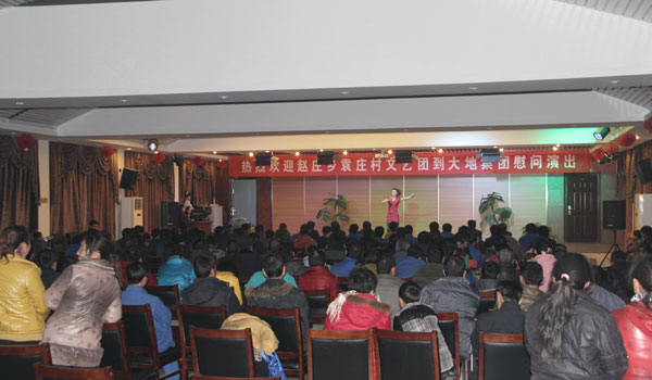 为活跃职工的文化生活,赵庄乡袁庄村文艺团受大地集团之邀,2012年12月8日晚到大地公司友情演出。县总工会主席郭鹏飞、县政府党组成员曲延辉、县政府办副主任李学敏、赵庄乡袁庄村党委书记袁军国应邀到场观看,大地集团领导及职工200多人兴致勃勃地观看了演出。  宝丰县的民间演出团体享誉省内外,被誉为“曲艺之乡”,袁庄村的文艺团就是其中的一支奇葩。演员们声情并茂,绘声绘色的演出令人久久回味,独唱、舞蹈、魔术等富有民间色彩的优秀文艺节目,赢得了观众的阵阵掌声。在丰富职工业余文化生活的同时,也增强了企地间的文化交流和友谊。